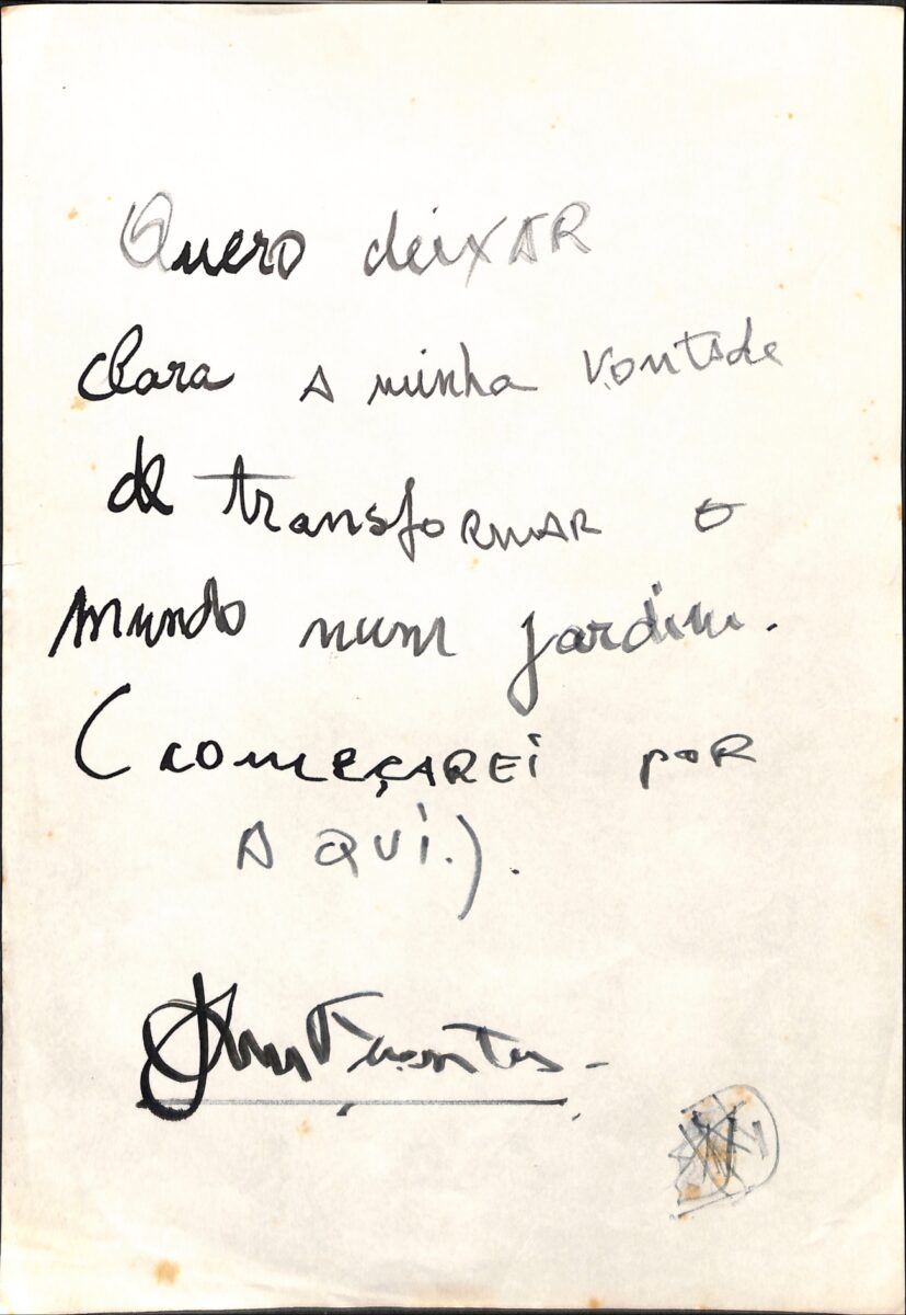 O desejo de Jose Luis Mora Fuentes, grande amigo e confidente de Hilda Hilst, guardado entre os documentos do acervo, não é apenas uma frase: é um gesto fundador. Nele, a ideia de jardim não parte de uma estética vegetal, mas, sim, de um projeto: um cultivo paciente, um trabalho de mãos, de espírito e de tempo; um cuidado com o que é frágil e indomável. Esse compromisso com a vida em seu estado mais intenso e vulnerável, fez brotar aquilo que floresce apesar das intempéries: a memória. Assim, semeado pelo amor, nasceu o Instituto Hilda Hilst: da convicção de que a obra e a memória de Hilda podem florescer incessantemente quando encontram o solo fértil do coração de outrem.